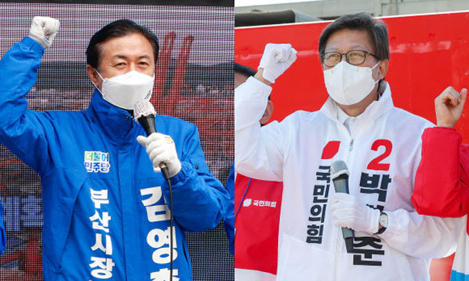 김영춘 더불어민주당 부산시장 후보(왼쪽)와 박형준 국민의힘 후보가 4·7재보궐 선거를 하루 앞둔 6일 부산진구 송상현동상, 가덕도 대항전망대를 찾아 유세하고 있다. 뉴스1 |