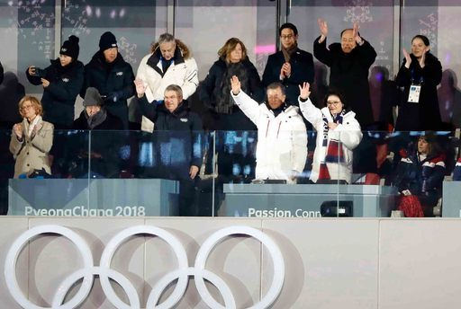 김여정 참석했던 평창동계올림픽 북한이 코로나19 사태를 이유로 올해 7월 개막 예정인 도쿄올림픽에 참가하지 않겠다고 6일 밝혔다. 사진은 2018년 2월9일 평창동계올림픽 개회식에서 남북공동입장 당시 문재인 대통령, 김정숙 여사(앞줄 오른쪽), 김여정 북한 노동당 중앙위 제1부부장(뒷줄 오른쪽), 김영남 북측 고위급 대표단장(〃 오른쪽 두 번째) 등이 자리에 일어서서 환영하는 모습. 세계일보 자료사진 |