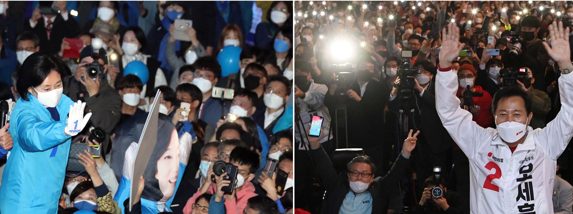 4·7 서울시장 보궐선거 투표일을 하루 앞둔 6일 오후 더불어민주당 박영선(왼쪽) 후보와 국민의힘 오세훈 서울시장 후보가 각각 마포구 서교동 상상마당과 서대문구 신촌에서 유세를 하고 있다. /국회사진기자단 |