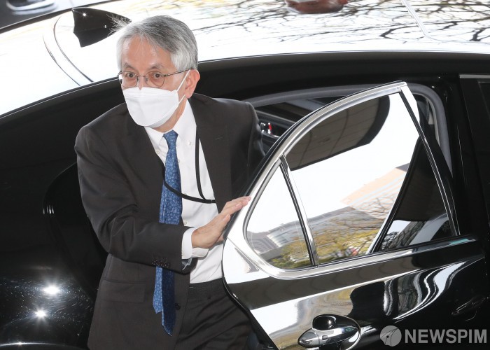[서울=뉴스핌] 김학선 기자 = 아이보시 코이치 주한 일본대사가 7일 오후 홍남기 경제부총리 겸 기획재정부 장관과 면담하기 위해 서울 종로구 정부서울청사에 도착하고 있다. 2021.04.07 yooksa@newspim.com