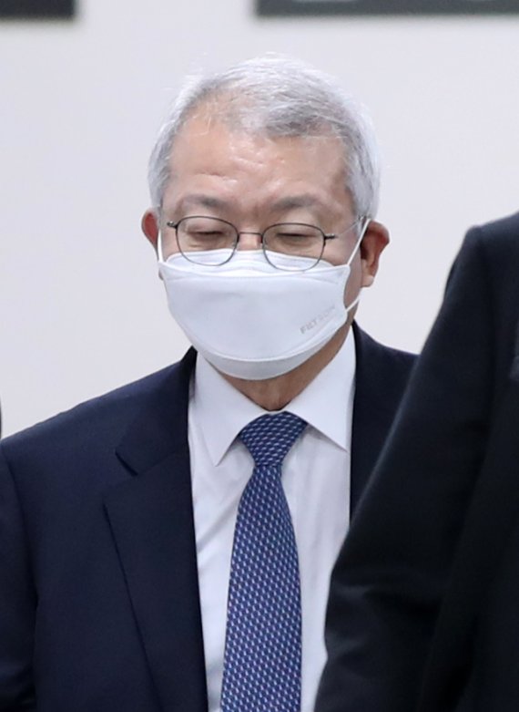 사법농단 혐의로 재판에 넘겨진 양승태 전 대법원장이 7일 오전 서울 서초구 서울중앙지법에서 열린 122차 공판에 출석하고 있다. 사진=뉴시스 |
