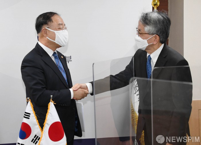 [서울=뉴스핌] 홍남기 경제부총리 겸 기획재정부 장관이 7일 오후 서울 종로구 정부서울청사에서 아이보시 코이치 주한 일본대사와 면담에 앞서 인사를 나누고 있다. [사진=기획재정부] 2021.04.07 photo@newspim.com