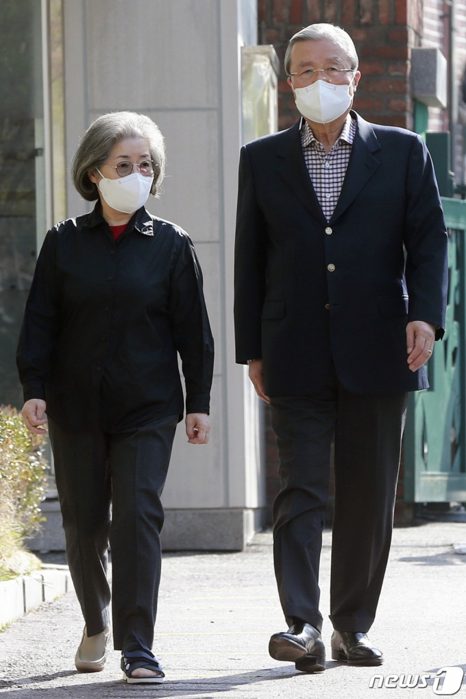 (서울=뉴스1) 국회사진취재단 = 김종인 국민의힘 비상대책위원장(오른쪽)과 배우자 김미경 이화여대 식품영양학과 명예교수가 7일 오전 4.7 재보궐선거 투표를 위해 서울 종로구 평창동 제3투표소에 들어서고 있다. 2021.4.7/뉴스1 |
