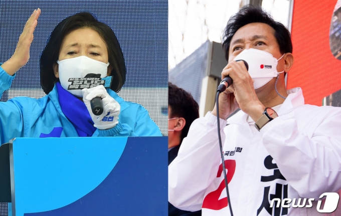 4·7재보선을 하루 앞둔 6일 박영선 더불어민주당 서울시장 후보(왼쪽)와 오세훈 국민의힘 서울시장 후보(오른쪽)가 각각 서울 종로구 동화면세점 앞과 노원구 상계백병원 앞 사거리에서 유세를 갖고 지지를 호소하고 있다. /사진=뉴스1 |