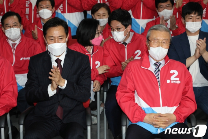 김종인 국민의힘 비대위원장과 오세훈 서울시장 후보 등 의원들이 7일 서울 여의도 중앙당사에 마련된 상황실에서 4·7 재보궐선거 방송사 출구조사 발표를 지켜보고 있다. /사진=뉴스1 |