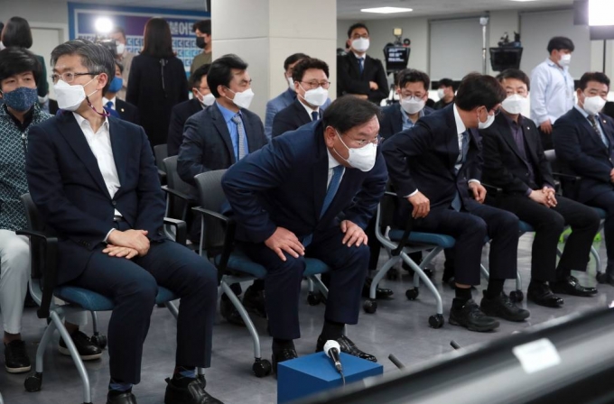 김태년 더불어민주당 대표 직무대행 등이 7일 오후 서울 여의도 당사에 마련된 상황실에서 4.7 재보궐 선거 출구조사 결과 발표를 시청하고 있다. / 사진제공=뉴시스 |