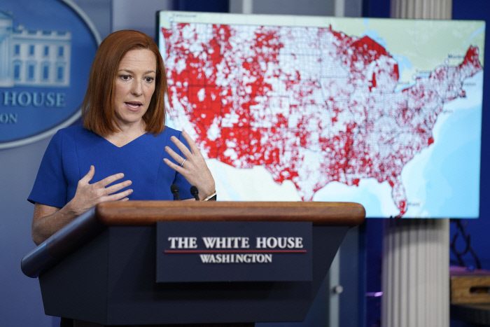 젠 사키 미국 백악관 대변인이 7일(현지시간) 백악관에서 언론 브리핑을 하고 있다. 워싱턴|AP연합뉴스 |
