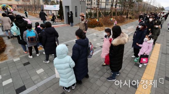 2021학년도 초·중·고교 신학기 첫 등교가 시작된 2일 오전 서울 강동구 강빛초등학교에서 학생들이 등교전 체온을 재기 위해 줄을 서고 있다./사진공동취재단 |