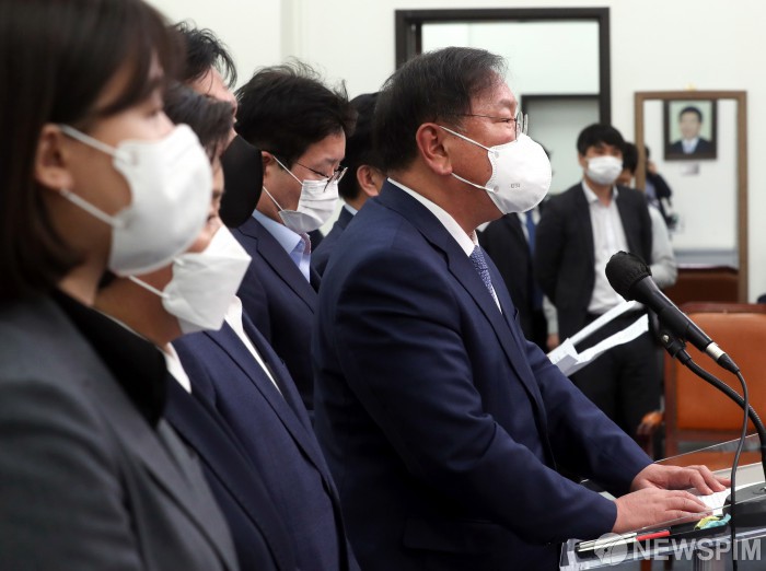 [서울=뉴스핌] 이형석 기자 = 김태년 더불어민주당 대표 직무대행이 8일 오후 서울 여의도 국회에서 4.7 재보궐 선거 패배의 책임을 지고 지도부 사퇴를 발표하고 있다. 2021.04.08 leehs@newspim.com