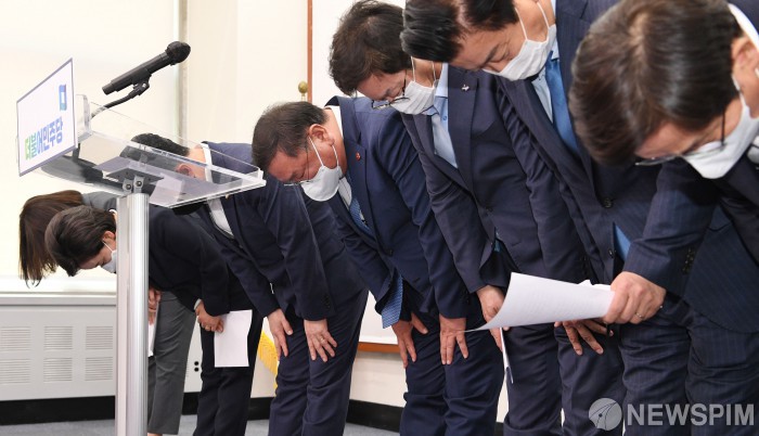 [서울=뉴스핌] 이형석 기자 = 김태년 더불어민주당 대표 직무대행과 지도부가 8일 여의도 국회에서 4.7재보궐 선거 결과에 책임을 지고 지도부가 전원 사퇴한다는 내용의 대국민 성명서를 발표한뒤 고개를 숙이고 있다. 2021.04.08 leehs@newspim.com