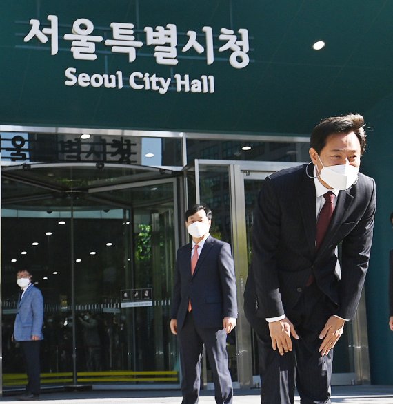 오세훈 신임 서울시장이 8일 오전 서울시청에 출근하고 있다. 서울시청 재입성에 성공한 오 시장의 임기는 이날부터 제8회 전국동시지방선거가 실시되는 2022년 6월 30일까지 약 1년3개월이다. 사진=김범석 가자 |