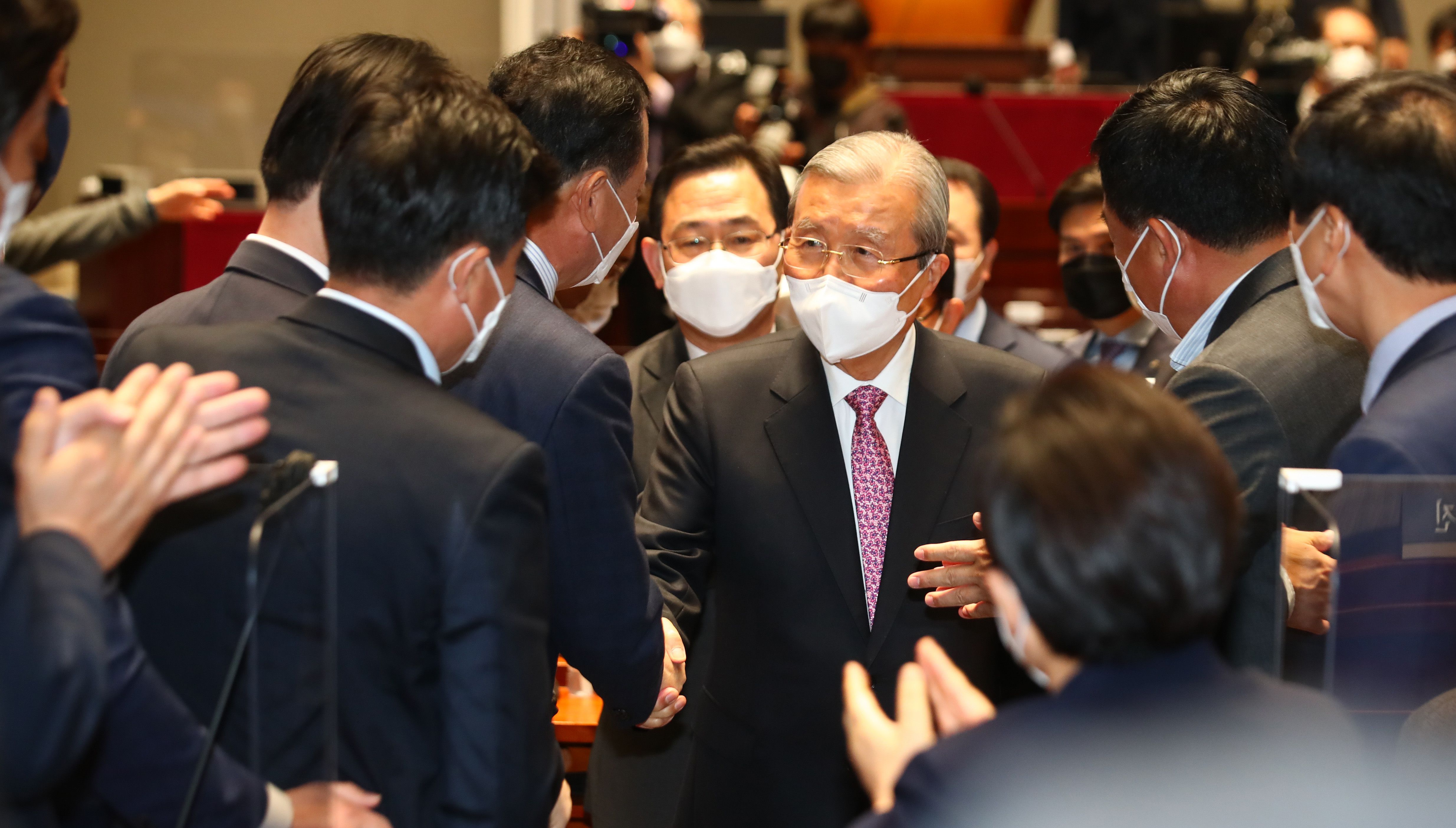 국민의힘 김종인 비상대책위원장이 8일 오전 국회에서 열린 의원총회를 마친 뒤 의원들의 박수를 받으며 퇴장하고 있다. /이덕훈 기자 |