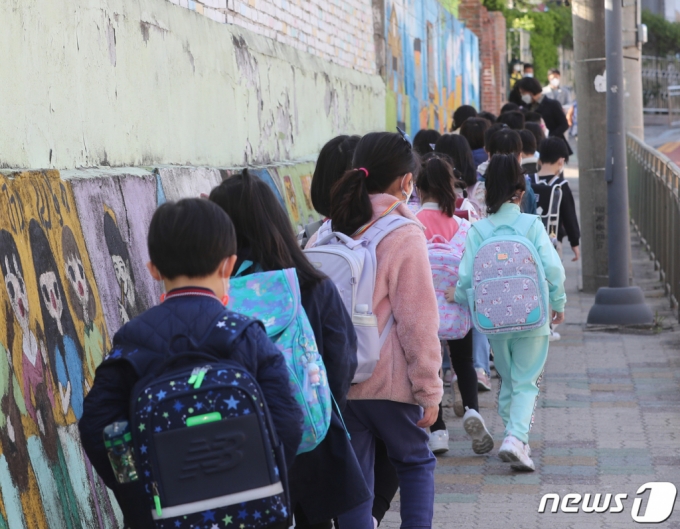 (서울=뉴스1) 이성철 기자 = 수도권의 거리두기 2단계가 현행 유지된 9일 서울의 한 초등학교에서 학생들이 등교를 하고 있다./사진=뉴스1 |