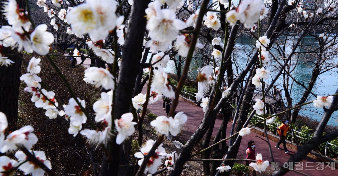 연일 포근한 날씨를 보이고 있다. 19일 오전 서울 송파구 석촌호수를 찾은 시민들이 활짝 핀 매화를 배경으로 산책을 하고 있다. 박해묵 기자 |