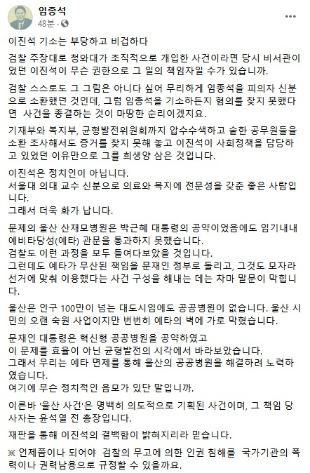 그는 "검찰 스스로도 그 그림은 아니다 싶어 무리하게 임종석을 피의자 신분으로 소환했던 것"이라며 "임종석을 기소하든지 혐의를 찾지 못했다면 사건을 종결하는 것이 마땅한 순리"라고 했다. 이어 "기재부와 복지부, 균형발전위원회까지 압수수색하고 숱한 공무원들을 소환 조사해서도 증거를 찾지 못해 놓고 이진석이 사회정책을 담당하고 있었던 이유만으로 그를 희생양 삼은 것"이라고 비판했다.