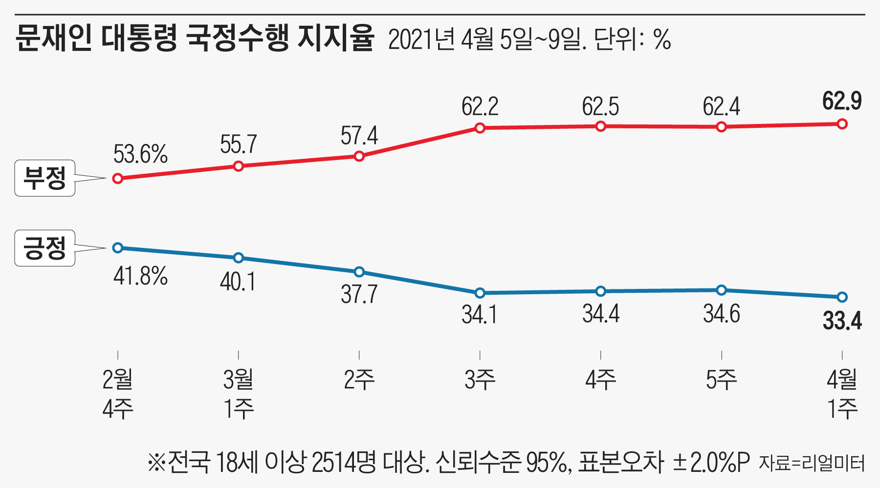YTN이 리얼미터에 의뢰해 지난 5일부터 9일까지 전국 18세 이상 유권자 2514명을 대상으로 실시한 4월 1주차 주간집계 결과(표본오차 95% 신뢰 수준에 ±2.0% 포인트)에 따르면, 문 대통령의 국정 수행에 대한 긍정 평가는 전주보다 1.2% p 떨어진 33.4%를 기록했다. 집권 이후 최저치다.