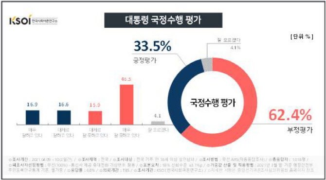여론조사 전문기관 한국사회여론연구소(KSOI)가 TBS 의뢰로 지난 9~10일 이틀간 전국 18세 이상 유권자 1018명을 대상으로 실시한 4월 2주차 정례 여론조사에서 대통령 국정수행에 대한 긍정평가는 33.5%로 직전 대비 6.5%포인트 급락한 것으로 나타났다. 취임 후 최저 수준이다. 부정평가는 5.9%포인트 오른 62.4%로 집계됐다. 긍정·부정 격차는 12.4%포인트 확대된 28.9%포인트였다.
