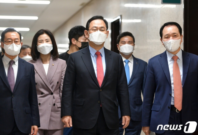 (서울=뉴스1) 신웅수 기자 = 주호영 국민의힘 당대표 권한대행이 12일 서울 여의도 국회에서 열린 비상대책위원회의에 참석하고 있다. 2021.4.12/뉴스1 |