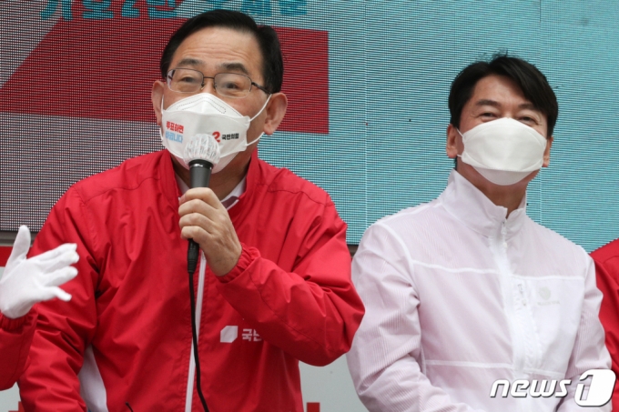 주호영 국민의힘 원내대표와 안철수 국민의당 대표가 지난달 29일 서울 여의도역 앞에서 열린 증권가 순회 인사 및 합동유세에서 시민들에게 오세훈 국민의힘 후보에 대한 지지를 호소하고 있다. /사진=뉴스1 |
