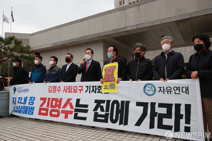 [서울=뉴스핌] 국회사진취재단 = 주호영 국민의힘 대표 권한대행이 13일 오전 서울 서초구 대법원 정문 앞에서 자유연대 주최 김명수 대법원장 사퇴 요구 기자회견에 참석해 발언을 하고 있다. 2021.04.13 photo@newspim.com