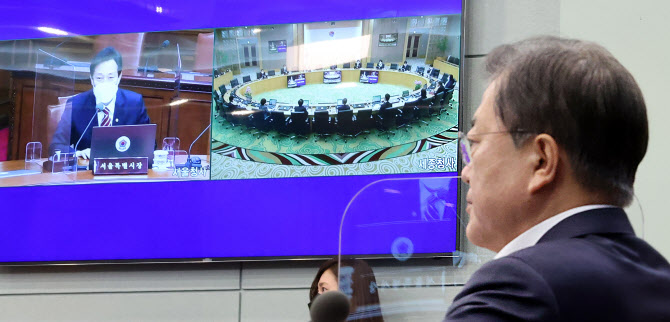 문재인 대통령이 13일 오전 청와대에서 열린 제16회 국무회의에서 오세훈 서울시장과 화상을 통해 인사하고 있다.(사진=연합뉴스) |