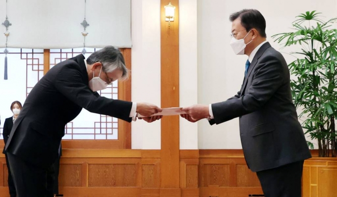 [서울=뉴시스]추상철 기자 = 문재인 대통령이 14일 오전 청와대 본관에서 열린 주한대사 신임장 제정식에 참석해 아이보시 고이치 주한 일본 대사로 부터 신임장을 받고 있다. 2021.04.14. scchoo@newsis.com |