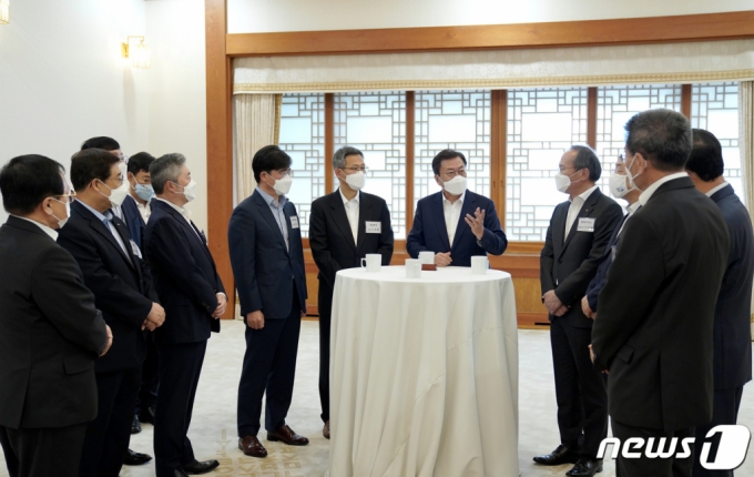 이날 회의에는 이정배 삼성전자 사장, 공영운 현대자동차 사장, 이석희 SK하이닉스 사장 등 기업인 8명이 참석했다. 문 대통령은 참석 기업인들의 이름을 일일이 소개하기도 했다.