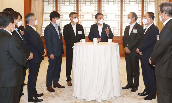 문 대통령은 투자와 고용 확대를 당부하며 정부 지원 의지를 거듭 밝혔다. 기업인들은 정부의 전폭적인 지원과 규제 완화 등을 건의했다. 문 대통령은 “각 부처 장관은 산업계 건의사항을 잘 검토해서 정책에 반영하고, 빠르게 추진되는 부분은 상황을 상세히 알려드리라”고 지시했다. 이정배 삼성전자 사장은 “정부와 기업이 지혜를 모으면 상황을 극복해 나갈 수 있을 것”이라며 정부의 지원을 요청했다. 공영운 현대자동차 사장도 “차량용 반도체를 확보하기 위해 열심히 해외로 뛰고 있는데, 정부가 출장을 갈 수 있도록 조치를 해줘 감사드린다”고 했다.