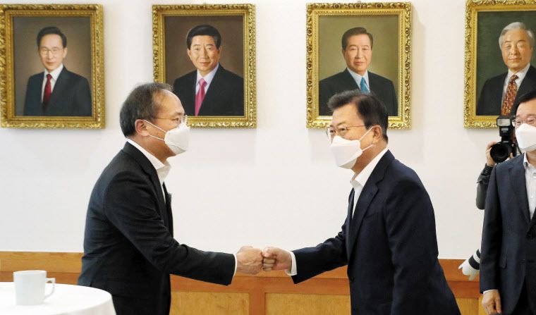 문 대통령은 “정부와 산업계의 협력으로 포용적 회복과 선도형 경제로의 전환을 이끌 것”이라며 관계 부처에 업계와의 소통 강화, 업종별 맞춤형 대책 마련, 과도한 규제 완화, 투자에 대한 세제 인센티브 개선 등을 주문했다. 그러면서 “저도 기업의 투자 현장을 계속 방문할 것”이라고 했다. 문 대통령은 최근 이호승 정책실장 등 청와대 참모진에게 “기업인들과의 소통을 늘리라”고 지시했다.
