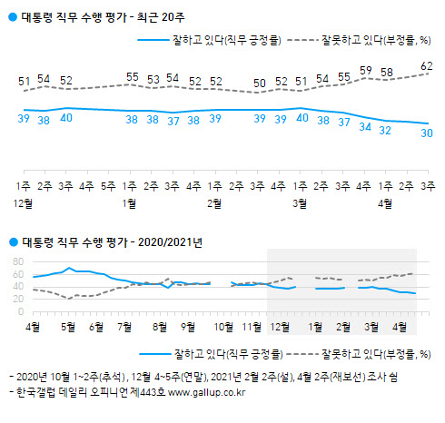 문 대통령의 국정지지율은 앞서 3월 3주차에 37%를 기록하며 1월 3주차와 같이 최저치에 머물렀다. 이후 줄곧 내리막인 상태다. 34%(3월 4주)→32%(4월 1주)→30%(4월 3주)로 3주 연속 최저치 기록을 경신하고 있다.