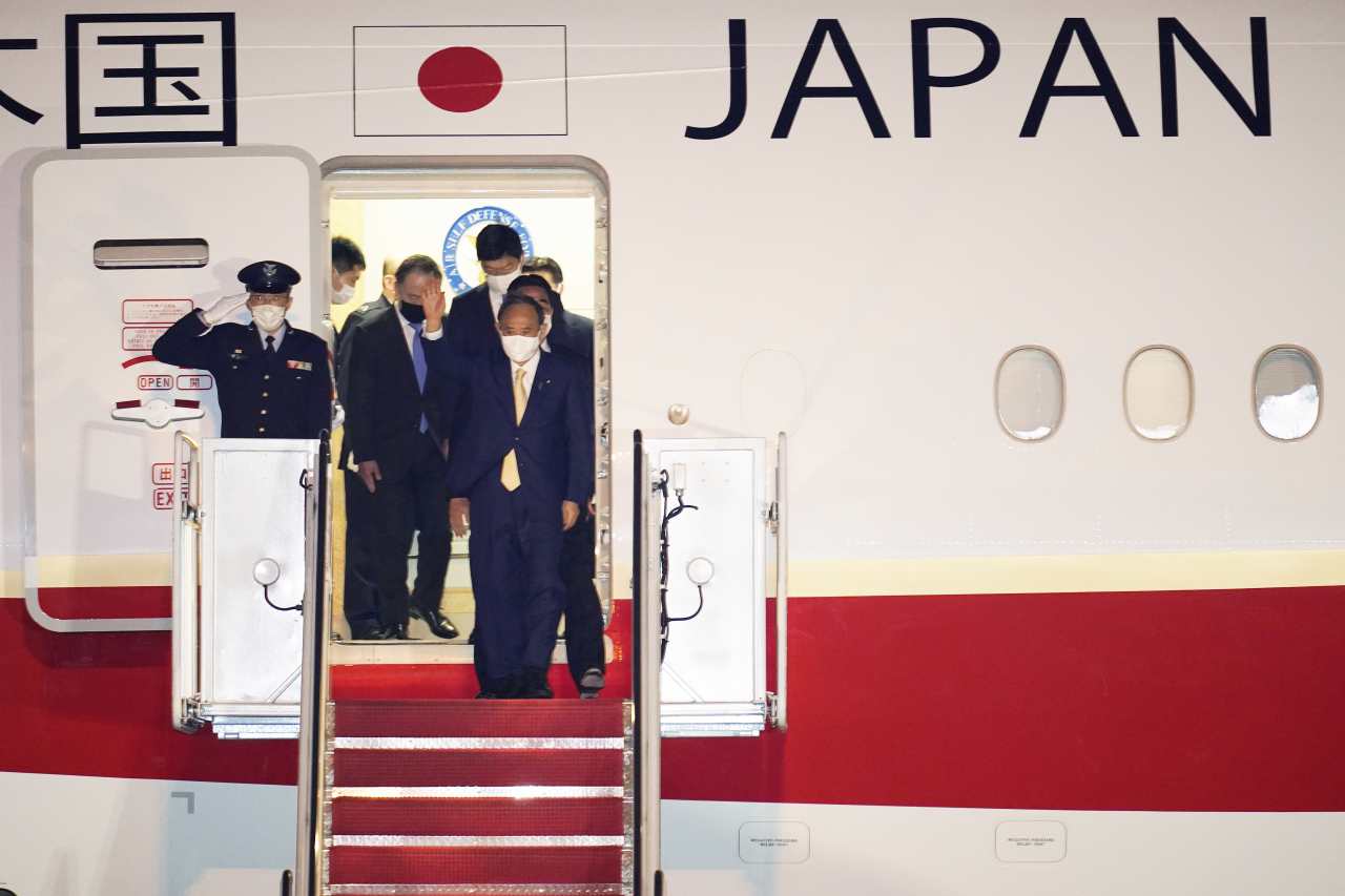 스가 요시히데(菅爲偉) 일본 총리가 15일(현지시간) 미국 메릴랜드주 앤드류스 공군 기지에 도착해 전용기에서 내리고 있는 모습. [AP] |