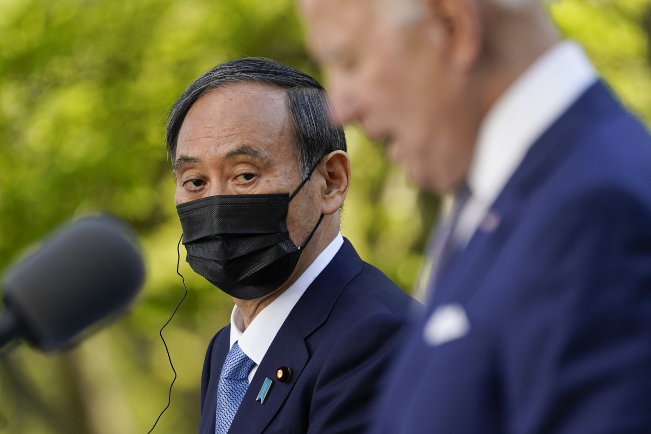 스가 요시히데(왼쪽) 일본 총리가 조 바이든 미국 대통령의 발언을 지켜보고 있다. [연합] |