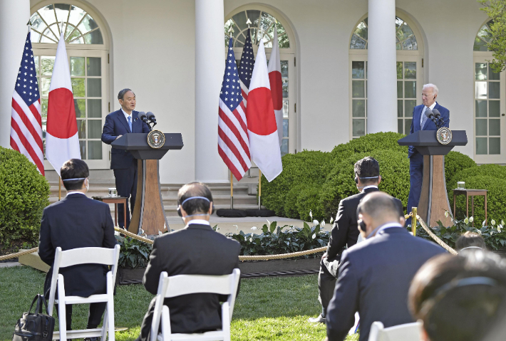 현지시간 16일 오후 조 바이든(오른쪽) 미국 대통령과 스가 요시히데 일본 총리가 미국 워싱턴DC 소재 백악관에서 정상회담을 한 후 공동 기자회견을 하고 있다. 연합뉴스 |