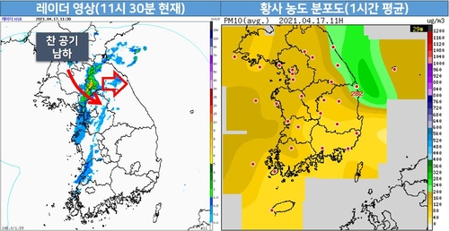 17일 레이더 영상(오전 11시 30분) 및 황사 농도 분포도(오전 11시) |