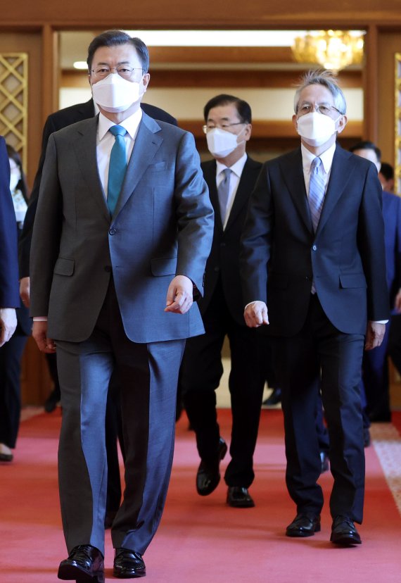 [서울=뉴시스]추상철 기자 = 문재인 대통령이 14일 오전 청와대 본관에서 주한대사 신임장 제정식을 마치고 아이보시 고이치(오른쪽) 주한 일본 대사, 정의용 외교부 장관 함께 환담장으로 이동하고 있다. 2021.04.14. scchoo@newsis.com <저작권자ⓒ 공감언론 뉴시스통신사. 무단전재-재배포 금지.> /사진=뉴시스화상 |