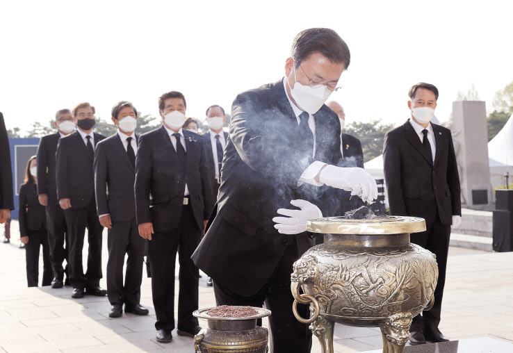 문재인 대통령이 19일 오전 서울 강북구 국립 4.19 민주묘지 기념탑에서 분향하고 있다. [연합] |