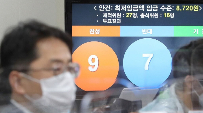 최저임금위원회는 14일 새벽 세종시 정부세종청사 고용노동부에서 열린 제9차 최저임금위원회 전원회의에서 내년도 최저임금은 시급 기준 8720원으로 최종 의결했다.(사진제공=연합뉴스) |
