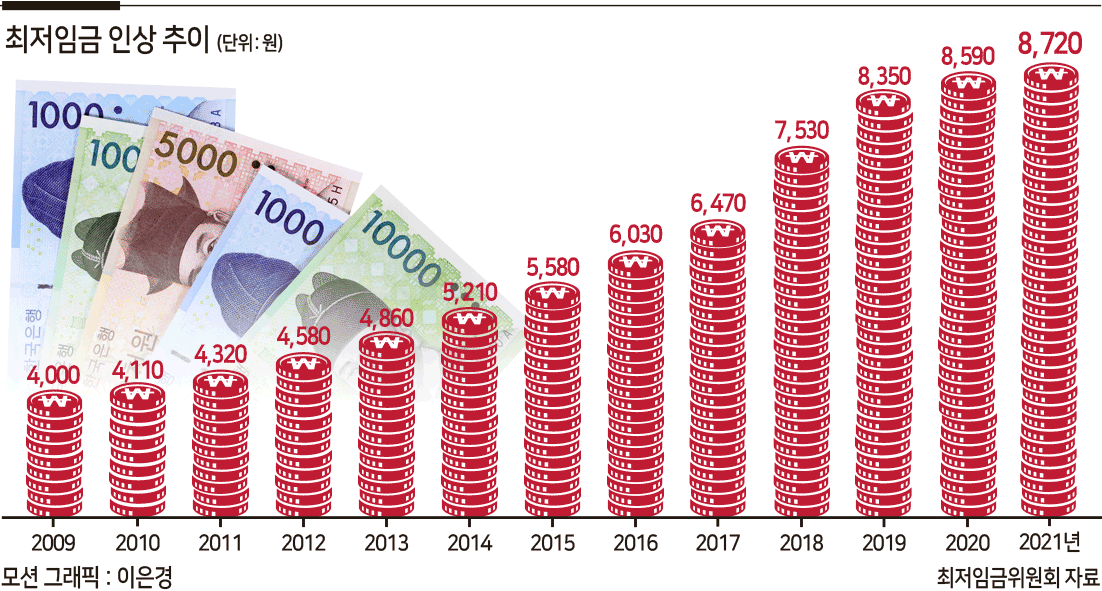 ‘최저임금 1만원’을 공약으로 내건 문재인 정부 마지막 최저임금을 결정을 위한 심의의 막이 오르면서 노사 양측의 극한 대립이 예고되고 있다. 2022년도 최저임금 인상폭을 놓고 경영계는 “동결”을, 노동계는 “1만원”을 주장하면서 격돌할 것으로 예상된다. |