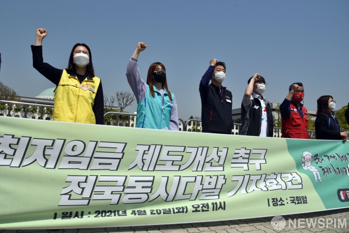 민주노총은 20일 서울 국회 앞에서 기자회견을 열고 "저임금 노동자와 그 가족의 생활 안정이라는 최저임금제도의 목적 실현을 위해 2022년 최저임금의 대폭 인상을 위한 투쟁을 벌일 것"이라고 밝혔다.