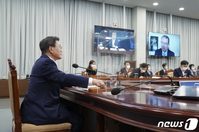 문재인 대통령이 지난 28일 오후 청와대 여민관 영상회의실에서 스테판 반셀 모더나 최고경영자(CEO)와 화상 통화하고 있다. (청와대 제공)/사진=뉴스1 |