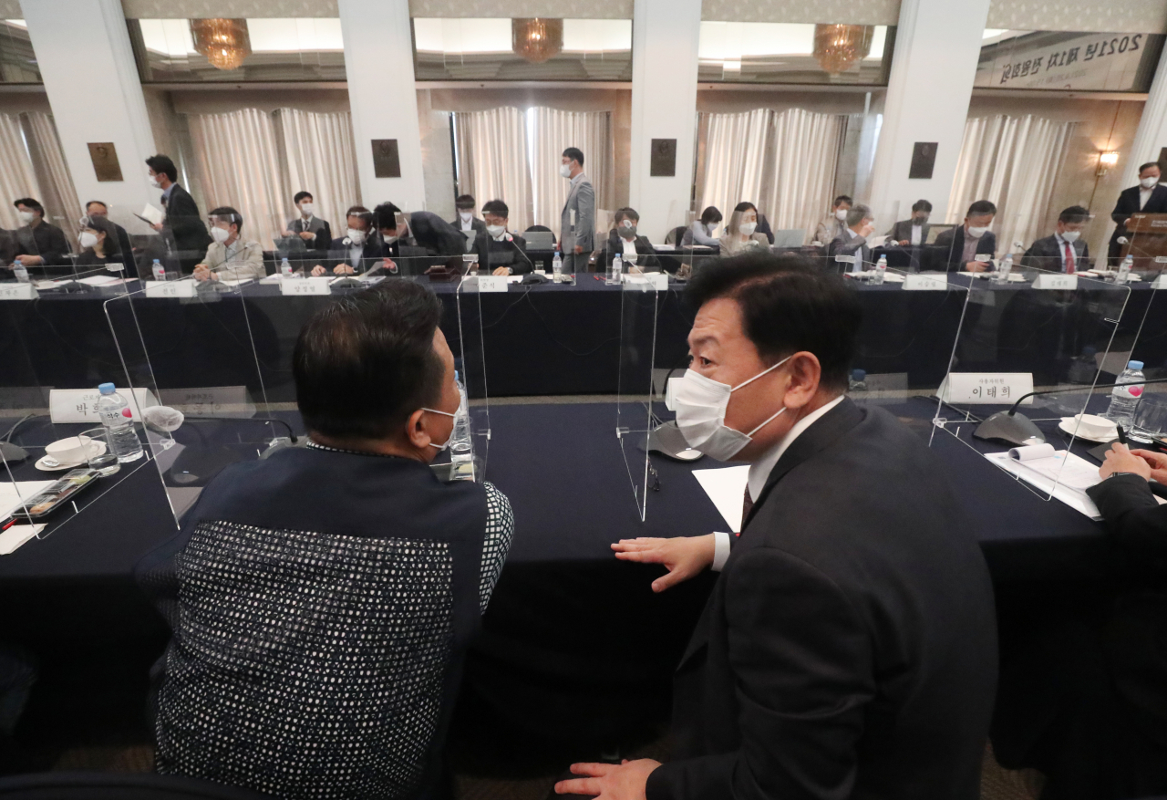 20일 오후 서울 중구 한국프레스센터에서 열린 최저임금위원회 1차 전원회의에서 이동호 근로자위원(왼쪽)과 류기정 사용자위원이 대화하고 있다. [연합] |