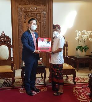 박태성(왼쪽) 주인도네시아 대사가 2020년 12월 10일 발리에서 와얀 코스테르 주지사와 만나 발리 공항 경전철 사업과 영사관 설치 관련 협력을 논의했다. [이미지출처=연합뉴스] |
