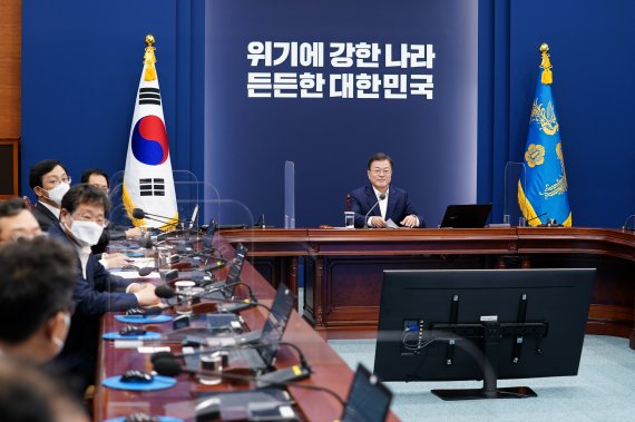 문재인 대통령이 지난 19일 청와대에서 열린 수석·보좌관회의에 참석해 이철희 정무수석 등 신임 참모진들을 바라보며 미소짓고 있다. 문 대통령은 이날 차질없는 백신 확보를 주문했다. /사진=뉴스1 |