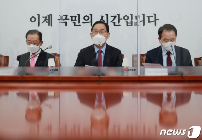 주호영 국민의힘 대표 권한대행(가운데)이 21일 오전 서울 여의도 국회에서 열린 비상대책위원회에서 모두발언을 하고 있다. 2021.4.21/뉴스1 |
