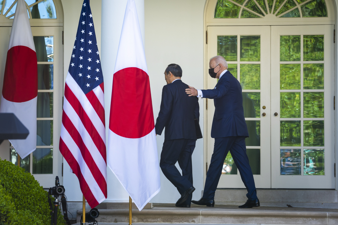 지난 16일(현지시간) 백악관 미일 정상회담 후 열린 기자회견에 참가했던 조 바이든(오른쪽) 미국 대통령과 스가 요시히데(菅義偉) 일본 총리가 회견장을 빠져나가고 있다. [EPA] |