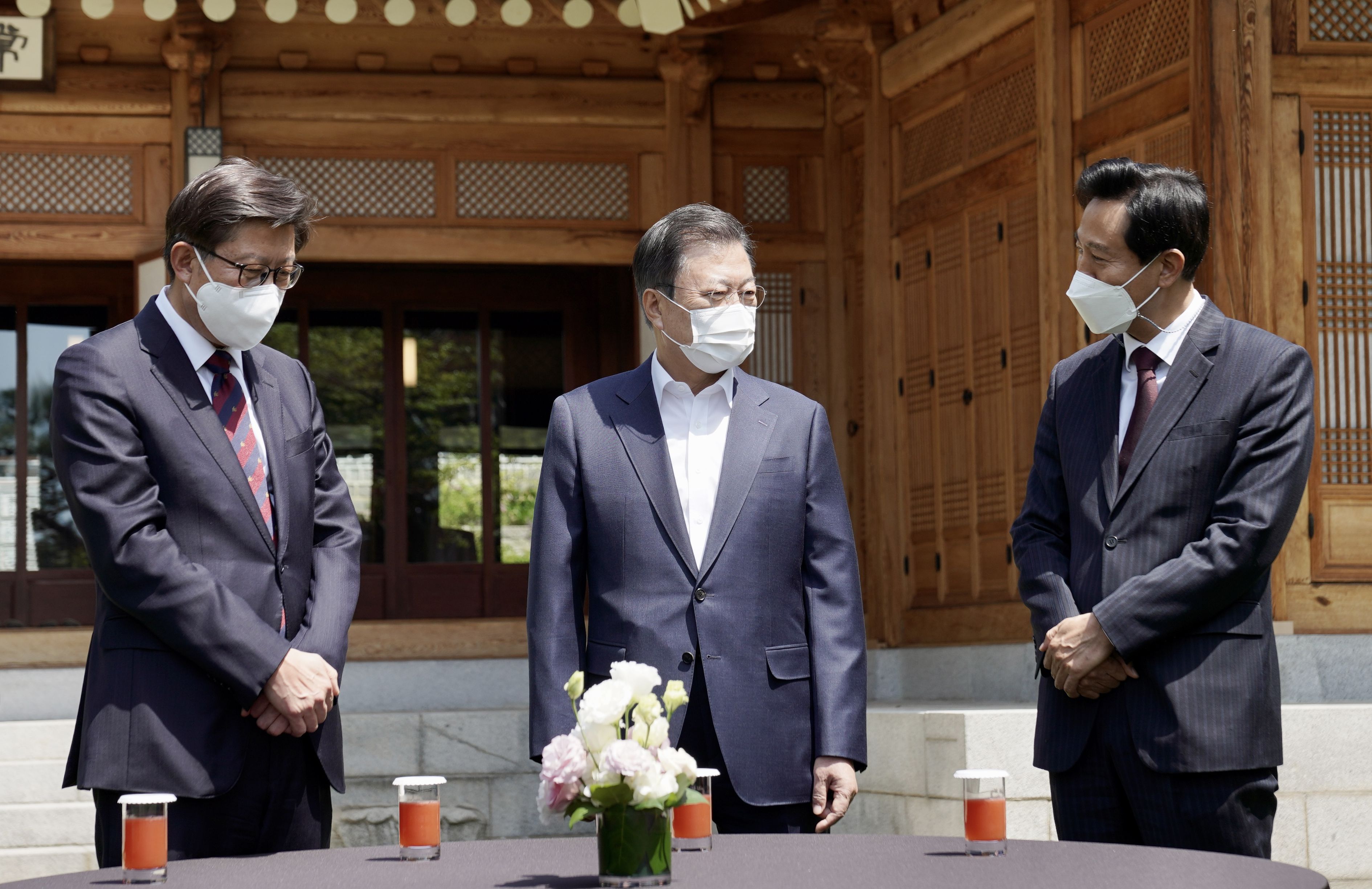 문재인 대통령은 21일 청와대 상춘재에서 4·7 재·보궐선거에서 당선된 오세훈 서울시장과 박형준 부산시장과 오찬을 함께 했다. 문 대통령이 제안하고 두 시장이 응해 성사된 첫 대면 만남이다. 문 대통령이 야당 인사만을 초청해 오찬하는 것은 이례적인 일로 평가된다.