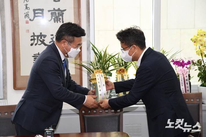 이철희 청와대 신임 정무수석이 21일 국회에서 윤호중 더불어민주당 원내대표 겸 비상대책위원장을 예방해 문재인 대통령의 축하난을 전달하고 있다.