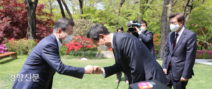 주먹 인사 문재인 대통령이 21일 청와대 상춘재에서 오세훈 서울시장과 박형준 부산시장을 만나 주먹 인사를 나누고 있다. 이날 문 대통령과 두 시장은 오찬을 함께하며 현안에 대한 얘기를 나눴다. 강윤중 기자 |