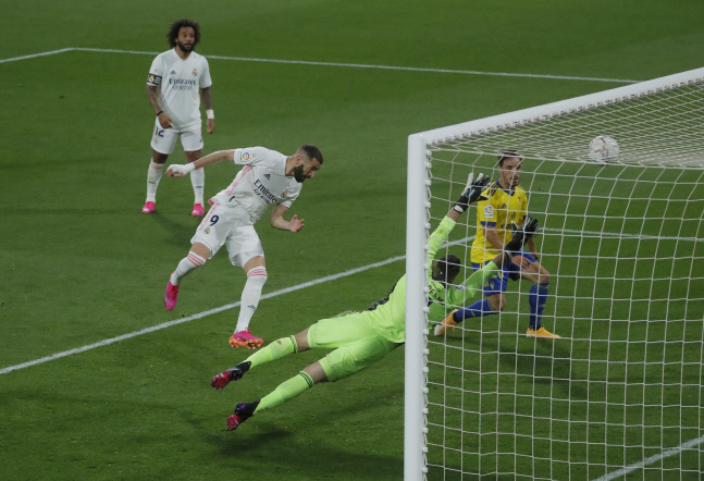 레알 마드리드의 카림 벤제마가 21일(현지시간) 에스타디오 라몬 데 카란자에서 열린 카디스와의 2020~2021 스페인 라리가 원정 32라운드에서 전반 40분 헤더를 성공시키고 있다. 카디스/로이터 연합뉴스 |