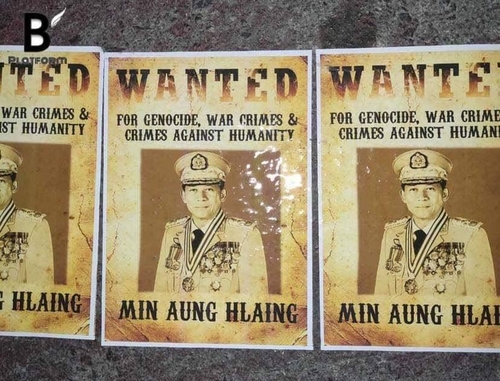 수배 전단에는 흘라잉 최고 사령관의 사진 및 이름과 함께 집단 학살과 전쟁 범죄 그리고 반인륜 범죄로 인해 수배 중이라는 문구가 적혀 있다.